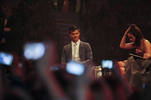 Manteniendose con su horario ocupado de prensa, las superestrellas internacionales Taylor Lautner y Kristen Stewart saludaron un enjambre de aficionados en un evento de prensa en Suecia ayer (21 de junio). La pareja se tomó su tiempo para firmar autógrafos a los aficionados antes de dirigirse hasta el escenario para charlar sobre la próxima película.
