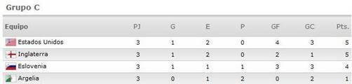 Estados Unidos e Inglaterra se clasificaron para la siguiente fase de Sudáfrica 2010 tras lograr ambos combinados vencer a argelinos (1-0) y eslovenos (1-0) respectivamente. Ambos equipos acumularon 5 puntos en los tres partidos que disputaron, aunque con una ventaja en diferencia de goles para los norteamericanos.Eliminados pues quedaron los combinados de Eslovenia y Argelia que solo pudieron obtener 4 y 1 puntos respectivamente, después de una definición electrizante en este grupo que tuvo en el partido de los Estados Unidos ante Argelia un match lleno de suspenso que se saldo con el gol postrero de Donovan en la valla argelina a los 91 minutos de juego.Con estos resultados, por haber quedado 1ero en el Grupo C, Estados Unidos espera al combinado que calificará como 2do del Grupo D, mientras que el once inglés se medirá con el primero de este mismo grupo.