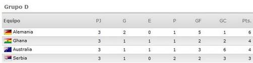 Tras una definición electrizante, los alemanes con 6 puntos en su haber y el combinado de Ghana con 4 son los dos equipos del Grupo D que continuarán al menos hasta los 8avos de final de esta Copa del Mundo Sudáfrica 2010. Fue algo no apto para cardiácos…Atrás, eliminados de la competencia, quedaron los combinados Australia y Serbia que solo pudieron obtener 4 y 1 puntos respectivamente. Y aunque el equipo australiano le aguó la partida al combinado balcánico, esto no le fue suficiente para remontar la abultada desventaja de goles en relación al once africano.Serbia deja así, sin pena ni gloria, una competencia que esperaba mucho más de un equipo con mayores credenciales que las que detentan Ghana y Australia. El triunfo obtenido ante el equipo alemán en la segunda fecha de la 1era fase nos dejo avizorar algo mejor, los hechos al final nos dijeron lo contrario... Con estos resultados, Alemania se enfrentará al equipo de Inglaterra el 27 de junio, pero antes lo hará la escuadra de Ghana a la de Estados Unidos el 26.