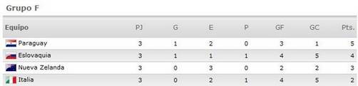 Fue una tercera fecha de locos. Nadie auguraba tal suerte para los italianos que cabizbajos dejaron el campo de fútbol. Es más, Italia con esta sorpresiva pero justa derrota termina último en su grupo. El regreso a la península de los azurra será pues un momento difícil de digerir. Lippi y compañía pagarán muy caro el fracaso que equivale al final de una época. Eliminado al igual que el equipo italiano, pero con 3 puntos honrosamente ganados, se encuentra la escuadra de Nueva Zelanda. La campaña de los neozelandeses es muy meritoria pues se va del mundial sin haber perdido un solo partido, sin duda alguna los de Oceanía merecían mejor suerte. Con estos resultados, Paraguay, 1ero en este grupo, espera el 29 de junio para enfrentar al que saldrá 2do del Grupo E, mientras que Eslovaquia, un dia antes el 28 del presente para jugar contra el 1ero de este mismo grupo.