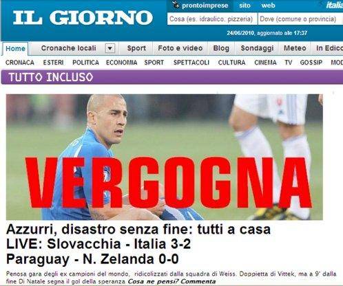 Una verguenza... le dan con todo a los italianos luego de su sorpresiva, pero justificada, derrota frente al once de Eslovaquia (3 - 2)... Y eso solo es el comienzo. A Marcelo Lippi, así como lo glorificaron cuando Italia fue Campeón del Mundo en el 2006, esta vez lo destrozarán. Por lo pronto, humildemente, Lippi ha reconocido su culpa y asumido toda la responsabilidad...