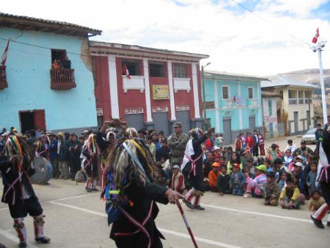 Los “viejos” (rucus) ostentan un disfraz consistente en una abundante peluca blanca y negra, confeccionada con colas de bueyes y adornada con cintas delgadas de colores. Portan saco y pantalón blanco o azul, pañuelo grande rojo o blanco doblada en triángulo sobre las espaldas, polainas listadas de colores, y sobre éstas cascabeles de bronce, cruzándoles el busto un rollo de soguilla de cabuya y una cinta, un bastón corto en la mano derecha. El personaje que representa al “toro” tiene como distintivo un pañuelo rojo o blanco, doblado en rombo, cubriéndole la cabeza y carrillos. En cada pierna una especie de holgada polaina de gruesa tela listada, camisa blanca con pantalón azul, adelante mandil de color, como banda cinta de color. Lleva con ambas manos la efigie de un toro hecha de varas de quinual (arbusto silvestre) cubierta por una piel de becerro provista de cola y armada de filudos cuernos Los bailarines danzan con gran agilidad al son del pinkullo y caja, que les permiten pararse de tiempo en tiempo con las piernas lateralmente separadas, sacudiéndose la peluca hacia adelante, doblando el tronco y levantándolo para luego lanzar su aguda interjección de ¡¡juyyy!! como expresión de fatiga o éxitos. Después del zapateo, empieza el juego del toreo, donde los rucos haciendo gala de su destreza y agilidad ruedan por los suelos a cada embestida del toro, en seguida emprenden la retirada cargando al repuntero por los aires.
