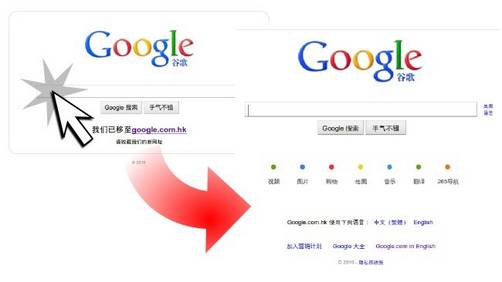 Entonces, Google ha optado por otro mecanismo: en lugar de la redirección, el sitio de Google China sólo contiene un enlace a Google Hong Kong. Y cuando digo solo es solo. Lo que te encuentras al entrar es una imagen con la casilla del buscador. Haces clic en la casilla y, por lo tanto, haces clic en la imagen. Y apareces en Google Hong Kong.