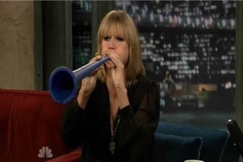 La esposa del cantante Seal estuvo como invitada en el show de Jimmy Fallon y demostró que sabe cómo tocar la vuvuzela con todas sus fuerzas.