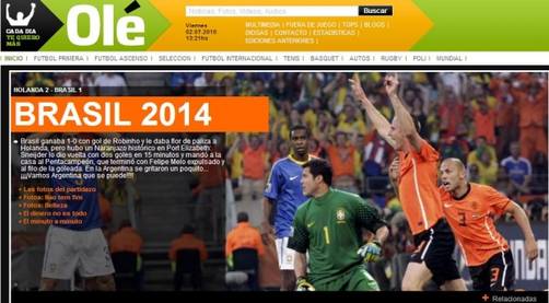 “Brasil 2014”, ironiza el diario deportivo Olé en su edición online respecto al campeonato que se organizará en el país vecino. “Del cielo al infierno: Brasil perdonó a Holanda y se despidió del Mundial”, señaló el diario “La Nación”.