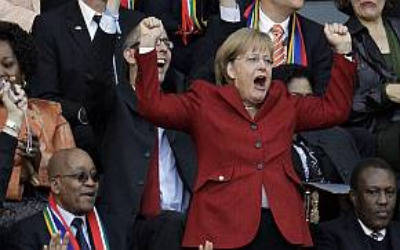 La canciller alemana Angela Merkel acudió al partido entre Alemania y Argentina, por los cuartos de final del Mundial. Bien ubicada en el estadio Green Point, de Ciudad del Cabo, la dirigente saltó con el gol de Thomas Müller en el pórtico albiceleste. Ella está acompañada por el presidente de Sudáfrica, Jacob Zuma, quien debe haberse sorprendido por su emotiva reacción. ¿Quién decía que era una “Dama de Hierro”?