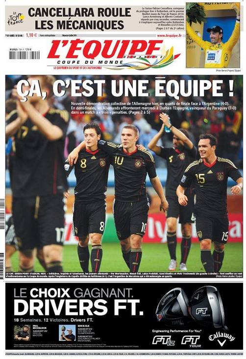"Alemania, este es un equipo", así titula su edición correspondente al 4 de julio de 2010 el cotidiano deportivo francés L'Equipe...
