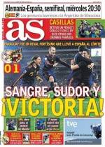 La prensa española se mostraba feliz este domingo luego de la victoria difícil pero "histórica" de su selección contra Paraguay (1-0). "Sangre, sudor y VICTORIA", tituló el diario deportivo AS, elogiando la calidad del equipo de América del Sur, "un rival muy duro, que llevó a España al límite de sus posibilidades". Su competencia Marca enfatizaba el "Fin de la mala suerte”. Una referencia al hecho de que España, campeona de Europa en 1964 y 2008, nunca había logrado hacerse invitar al grupo de los cuatro finalistas en una Copa del Mundo. Su mejor actuación se llevó a cabo en 1950, un cuarto lugar, cuando entonces no había semifinales. Paso a la "terrible Alemania" La prensa catalana, El Mundo Deportivo en primer lugar, resaltaba también el carácter "histórico" de esta performance del país de Don Quijote. "España avanza hacia la gloria”, decía El País soñando y evocando "una victoria dolorosa con un gol de Villa y una demostración de alto nivel de Iker Casillas”. El diario El Mundo prefirió destacar la proeza del nuevo goleador del Barcelona, el delantero David Villa: "El hace historia". El ex jugador del Valencia (63 selecciones, 43 goles) solo tiene que marcar un gol más para igualar a Raúl como el mejor goleador de la historia de la Roja. Ahora, paso a la “Terrible Alemania”, anuncia El Mundo Deportivo.Fuente: L’Equipe