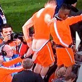 En la celebración del partido disputado este martes entre Uruguay y Holanda, y que significó el pase de la selección tulipán a la final del Mundial de Sudáfrica, Arjen Robben fue objeto de las bromas de sus compañeros. Al futbolista del Bayern de Múnich le bajaron los pantalones justo en el momento en el que todas las cámaras enfocaban al jugador, inmerso en el festejo por la victoria del equipo neerlandés.