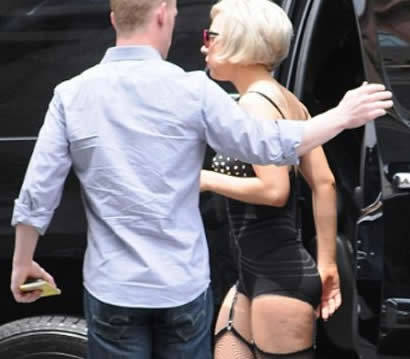 La artista, que vestía un body negro, medias de red, portaligas y tacones altos, fue fotografiada mientras bajaba de su auto, junto a sus guardaespaldas, y ya que su ropa era reveladora, dejó a la vista su "piel de naranja".