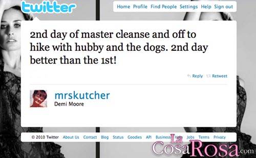 El sábado Ashton Kutcher, de 31 años, informaba que comenzaban la Master Cleanse. Nueve horas después confesaba que se moría por un filete, una cerveza y un blow-pop -un snack dulce-. Mientras, su esposa, de 47 años, decía que encontraba el segundo día de dieta más fácil que el primero e insistía que la estaba haciendo para estar más sana y no para perder peso.