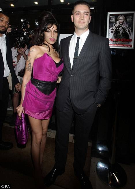 La cantante lució un cortísimo vestido morado, y un cinturón-corsé, dejando los talones desnudos. Winehouse apoyaba a su novio, quien dirigió la película de terror, en el estreno.