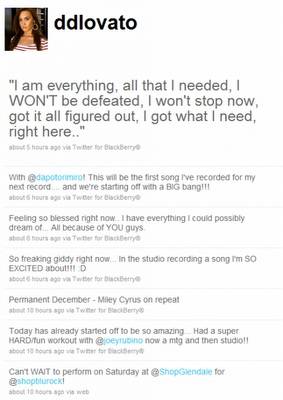 "Yo soy todo, todo lo que necesitaba, no voy a ser derrotada, no voy a parar ahora, lo tengo todo resuelto, yo tengo lo que necesito, aquí mismo" son las primeras lineas que dá a conocer Demi de su nueva canción a través de su cuenta en twitter.Mmm... ¿Lees parece algo despechada la canción de Demi?, ¿Ascaso quiere convencerse de que está bien sin Joe Jonas?... ¿Ustedes que opinan?.