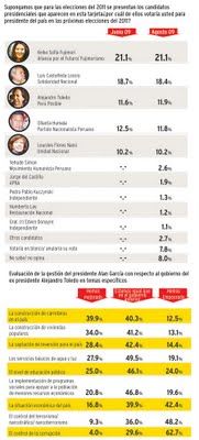 La última encuesta nacional de CPI trae como novedad importante que el ex presidente Alejandro Toledo asciende al tercer lugar en las preferencias ciudadanas para la elección presidencial del año 2011. Ello demuestra que, conforme pasa el tiempo, la mayoría de peruanos compara y se da cuenta que durante el gobierno de Alejandro Toledo se estuvo en una condición muy superior a la que se vive en la actualidad con el doctor Alan García.