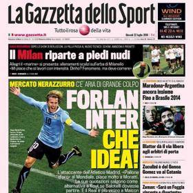 La Gazzetta dello Sport lleva hoy en su portada una gran foto de Diego Forlán con el siguiente titular: Forlán-Inter: ¡qué idea!
