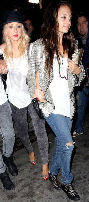 Richie y Aguilera entraron en un club cerca de la medianoche con unos amigos y guardaespaldas; ambas usaron similares tops con escot. Las dos estrellas se instalaron en una mesa del rincón VIP y bebieron champán. "Hablaron durante todo el tiempo", dijo un testigo. "Estaban sentados en la parte superior de la banqueta, escuchando música y chatteando."