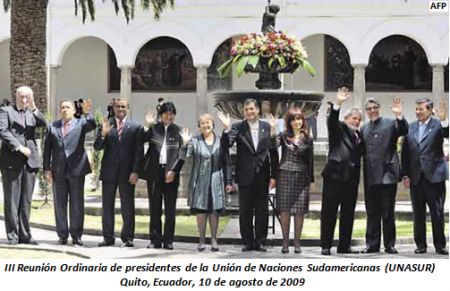 El presidente ecuatoriano Rafael Correa escogi el 10 de agosto, fecha del bicentenario de la Independencia de su pas y de su asuncin presidencial del perodo 2009-2013 ?tras su reeleccin el 26 de abril pasado? para recibir el cargo de la presidencia "pro-tmpore" de la Unin de Naciones Sudamericanas (Unasur) de manos de la presidenta chilena Michelle Bachelet. Asimismo se llev a cabo la III Reunin Ordinaria, suscribindose la Declaracin de Quito, en la cual por falta de consenso entre los pases ?a pesar de acuerdo previo en agenda? no se trat el tema de mayor foco de controversia actual surgido por el convenio para el uso de EE UU de siete bases militares en Colombia.