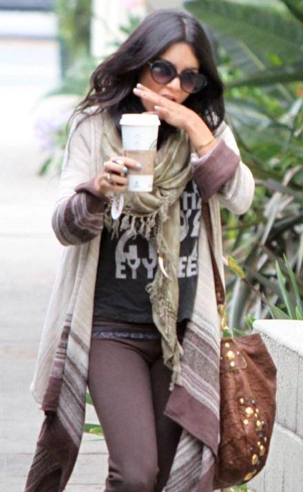 Vanessa Hudgens se detuvo en un local de Starbucks antes de dirigirse a un lugar de estudio en West Hollywood. Nessa cambió su vestido de verano de esta mañana para ajustarse al clima frío con un suéter largo, pantalones de yoga y una camisa marrón vintage.