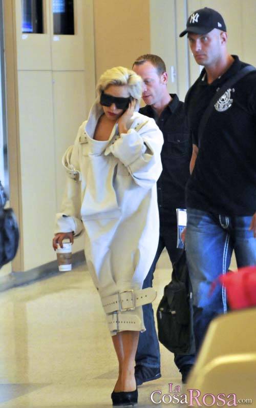 Mientras los rumores sobre las fotos se propagan Gaga llegaba la aeropuerto de Houston, Texas esta semana, luciendo un modelo que sólo ella es capaz de llevar, aunque acabe por los suelos: una chaqueta extraña y enorme en color blanco, cerrada en la parte inferior con unas correas y unos zapatos negros de tacón da aguja con su cara tapada por unas grandes gafas de sol. Iba acompañada de su guardaespaldas, sin embargo, Luc Carl, el novio con corta y se reconcilia, no ha sido visto en ningún momento. Gaga y el chico podrían haber vuelto a ser pareja tras haber sido vistos besándose en una piscina.