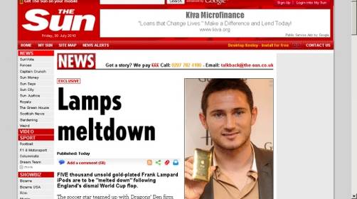 La mala campaña de Inglaterra en Sudáfrica 2010 no solo costó críticas a los seleccionados ingleses, sino que además provocó pérdidas económicas. Frank Lampard es uno de los más afectados, ya que antes del Mundial se lanzó unos iPods bañados en oro pertenecientes a la línea del jugador, sin embargo 5 mil de estos serán derretidos para aprovechar el valioso metal porque no fueron vendidos.