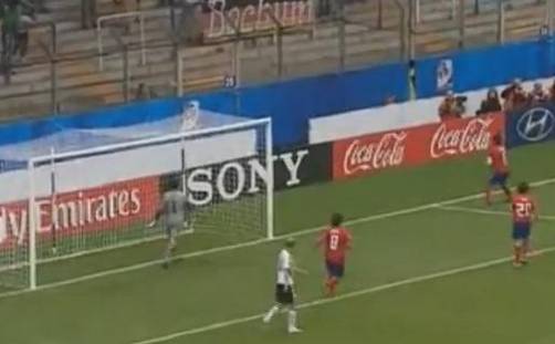 El balón da en el travesaño y no sale del campo de juego. La jugadora de Corea del Sur, no se percata de ello, y la toma con las manos antes de que la pelota toque el gramado. La árbitro consulta con la juez de linea y sanciona el penal.