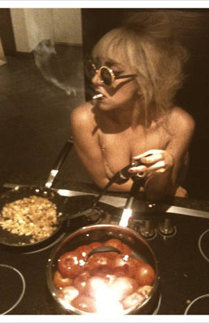 Fue su productor musical Fernando Garibay quien colgó esta singular imagen en la que Lady Gaga aparece cocinando con poca ropa en la casa del mencionado profesional de sonido. La diva está fumando, la foto fue enviada en las redes sociales con el siguiente mensaje: