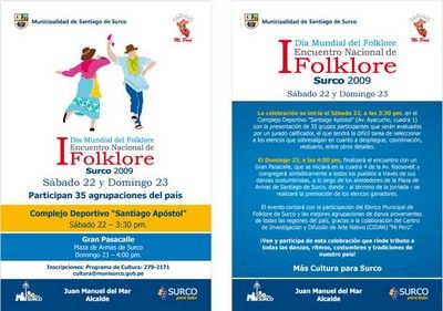 La Municipalidad de Santiago de Surco, con motivo de celebrarse el "Día Mundial del Folclore", desarrollará el 22 y 23 de agosto el "I Encuentro Nacional de Folclore" Surco 2009", el mismo que contará con un gran espectáculo, donde harán gala de sus cualidades artísticas 35 grupos del interior con lo mejor de su repertorio de música y danzas tradicionales.