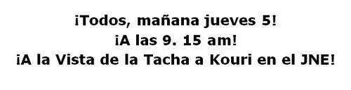 ¡Todos a la Vista de Tacha a Kouri en el JNE! Mañana jueves a las 9.15 am, se verá en Audiencia Pública la Tacha a Alexander Kouri interpuesta por el doctor Guillermo Olivera Díaz en el recinto del Jurado Nacional de Elecciones en la Av. Colmena a media cuadra de la Plaza San Martín en el centro de la capital. Sustentará la Tacha, con riqueza argumental y multitud de pruebas expuestas de manera pública con tesón ejemplar, el notable jurista Guillermo Olivera Díaz. El silencio taimado, metódico, organizado y simultáneo de la gran prensa pareciera confesar su deseo, intención y complacencia con la candidatura del controvertido Alexander Kouri el mismo que alternaba con Vladimiro Montesinos pocos años atrás y está convertido en un "eficiente" alfil de la democracia como sistema. Asistir mañana, sea cual fuere el resultado -del cual hay presagio razonable- constituye una pelea contra la improvisación, irregularidades y defectos monstruosos del Partido Cambio Radical que ha incumplido todos los requisitos exigidos por la ley de Partidos Políticos. Sólo gracias a la vista gorda del "experto" en asuntos electorales del JNE, Fernando Rodríguez Patrón, que se hizo el bobo, pasando por alto todas estas irregularidades ha sido posible que Cambio Radical albergue la candidatura de Kouri. Ha preguntado el doctor Olivera ¿cuánto ha costado este favor? Ir el jueves a primera hora, la entrada es libre, basta con mostrar su DNI, representa un acto digno y el testimonio de marcar la diferencia con la asquerosa actitud de los medios de prensa que han silenciado con descaro la notable y solitaria lucha del doctor Guillermo Olivera Díaz. Las amenazas contra su integridad física, los cierres bruscos de autos en diversos cruceros de la ciudad, las invitaciones aviesas para almorzar o cenar a ver si se deja comprar, son parte del enorme complot contra la democracia peruana. ¡Reaccione y proteste, vaya al JNE a demostrar a los integrantes de ese colegiado que los peruanos están hartos de tanta suciedad en la vida pública! Si la impostura pasa, no será sino la victoria pírrica de quienes han hecho del Perú un potrero en que el dinero sucio, la coima, la estafa y el latrocinio son parte del catecismo diario y repugnante de la vida de sus protagonistas. ¿Es usted parte de aquello? ¡Usted tiene la respuesta! Herbert Mujica Rojas