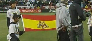 Algo que es importante señalar sucedió antes del inicio del partido entre el Real Madrid y el América. En el marco de lo más inocente que puede suceder en la antesala de muchos encuentros, algo que no podía pasar desapercibido al ojo advertido sucedió. Los niños que llevaban la bandera de España, no portaban la bandera de la España democrática, sino la oriflama de la España franquista. La prueba, la insignia que esta llevaba, el águila. ¡Vaya confusión!¿Qué está sucediendo? ¿Se trata una vez mas de la proverbial ignorancia que algunos atribuyen a muchos del norte de América? O, ¿alguien que ha querido jugar una mala pasada aprovechándose de la inocencia de estos críos?Otra vez, tengan más cuidado... por si acaso, la España a la que hace alusión la bandera que se mostró nunca más volverá...DANTE