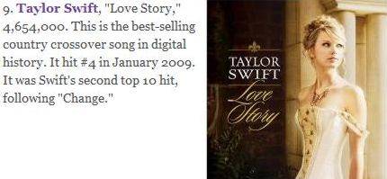 Taylor Swift y su "love story", alcanzó la cifra de 4,654 millones de descargas digitales. Ésta es la mejor canción de country vendida en la historia digital. Este hit, # 4 en Enero de 2009, fue el segundo hit de Swift en el top 10, después de "Change".Entretando, la reina adolescente de Disney, Miley Cyrus, ha acaparado 4,105 millones de descargas para su "Part in the USA". Este himno pop del verano fue el # 2 en tres semanas, empezando en Agosto de 2009. Fue el cuarto hit de la estrella adolescente en el top 10, siguiendo a "See Yoy Again", "7 Things" y "The Climb". Cyrus, 17, es la artista más joven en esta lista.¿Quiénes más integran esta galardonada lista? Echa un vistazo:01. The Black Eyed Peas, "I Gotta Feeling," 6,049,000.02. Flo Rida featuring T-Pain, "Low," 5,640,000.03. Lady Gaga featuring Colby O'Donis, 5,616,00004. The Black Eyed Peas, "Boom Boom Pow," 5,517,00005. Lady Gaga, "Poker Face," 5,451,000.06. Jason Mraz, "I'm Yours," 5,267,00007. Ke$ha, "TiK ToK," 5,078,000.08. Timbaland featuring OneRepublic, "Apologize," 4,747,000.11. Coldplay, "Viva La Vida," 4,588,00013. Katy Perry, "Hot N Cold," 4,461,00015. Beyonce, "Single Ladies (Put A Ring On It)," 4,166,000.16. Lady Gaga, "Bad Romance," 4,154,000.17. Kanye West, "Stronger," 4,106,000.19. Lady Antebellum, "Need You Now," 4,028,000.20. Leona Lewis, "Bleeding Love," 4,026,000.