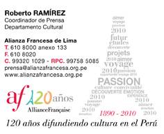 Lugar: Sala Lumières de la Alianza Francesa.Dirección: Av. Arequipa 4595, Miraflores.Día: Jueves 12 de agosto de 2010Hora: 10:30 a.m. Como parte de las actividades por su 120 aniversario, la Alianza Francesa de Lima presenta “Suma Sumaq, Le Pérou à Paris” conjunto de eventos que se desarrollarán en la capital francesa, en el marco del festival “Alliances en résonance” auspiciado por la Fondation Alliance Française con sede en París. El objetivo del Festival es dar a conocer en Francia una imagen real del Perú a través de manifestaciones culturales representativas de la creatividad peruana. Para dar mayores detalles de este evento la Alianza Francesa de Lima tiene el agrado de invitar a usted a una conferencia de prensa el próximo jueves 12 de agosto a las 10.30 a.m. en la Sala Lumières de nuestra sede central en Av. Arequipa 4595, Miraflores. Conferencia de prensa:- 10.30 a.m. proyección de imágenes de los artistas participantes.- 10.45 a.m. diálogo con comité organizador y artistas.- 11.15 a.m. Coffe break. Por favor confirmar su presencia por teléfono al 610 8000 o por correo-e: prensa@alianzafrancesa.org.pe