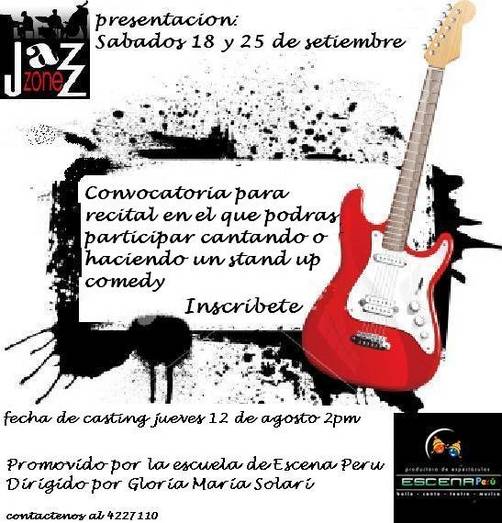 Podrás participar cantando o haciendo stand up comedy. Este evento es promovido por la escuela de Escena Peru y dirigido por Gloria Maria Solari. El casting sera el jueves 12 de agosto desde las 2 de la tarde. (Dir. Tudela y Varela 455 Miraflores)