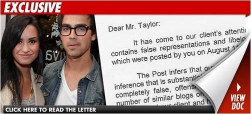 TMZ ha imformado... el abogado de Joe acaba de enviar una carta a un blog de entretenimiento canadiense llamado Zack Taylor... acusandolo por una historia que publico que implica que Joe Jonas (20) y Demi (17) "están involucrados en una relación ilícita".En la carta, obtenida por TMZ, el abogado de Joe reclama que "la historia es completamente falsa, ofensiva y difamatoria" - y acusa a Taylor de "intentar maliciosamente atacar y desvalorizar el buen nombre de Joe y su reputación".