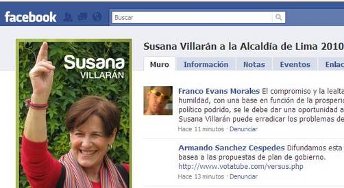 Los seguidores de Susana Villarán en Facebook ya suman 14.169 y los mensajes de aliento no cesan, apoyan su candidatura y ven con buenísimos ojos que una mujer, y mujer socialista asuma las riendas de la ciudad. Pero la euforia de las últimas horas podría deberse a que la candidatura de Alex Kouri se ha resquebrajado por la tacha impuesta, o a que Lourdes ha sido dañada casi de muerte mediática por las denuncias que la acercan peligrosamente al narcotráfico.