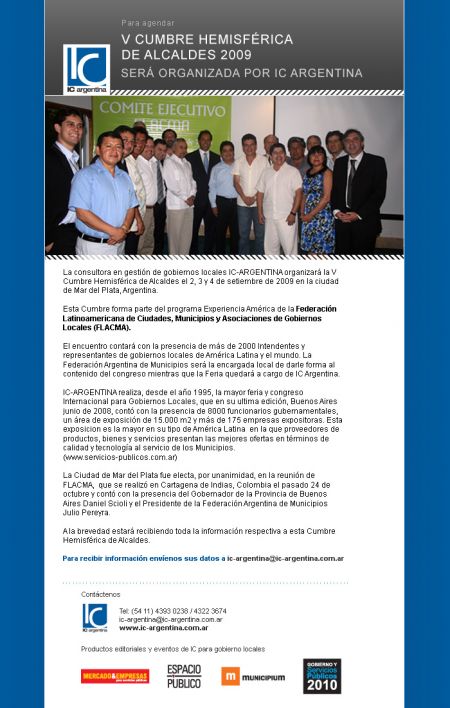 En nombre del Consejo y del Comité Ejecutivo de la Federación Latinoamericana de Ciudades, Municipios y Asociaciones de Gobiernos Locales (FLACMA), Sección Regional de la Organización Mundial de Ciudades y Gobiernos Locales Unidos (CGLU), tenemos el agrado de invitarle a que nos acompañe y participe activamente en el Quinto Congreso Latinoamericano de Ciudades y Gobiernos Locales "EXPERIENCIAMÉRICA", que se realizará los días 2, 3 y 4 de Septiembre de 2009, en la ciudad de Mar del Plata, Provincia de Buenos Aires, República Argentina.