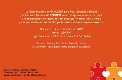 Los resultados del proyecto "Hoteles por la vida Perú", y la premiación a hoteles, serán presentados por la coordinadora de ONUSIDA para Perú, Ecuador y Bolivia, y la Gerente General de APROPO el 10 de setiembre a las 11 de la mañana, en las instalaciones de la OIT (Las Flores 275 San Isidro).