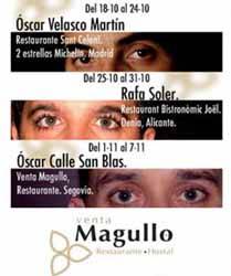 Su promotor, el actual gerente y chef ejecutivo de Venta Magullo, Óscar Calle San Blas, tomó la iniciativa de la celebración de dichas jornadas en otoño de 1999, con el convencimiento de que el evento serviría, en primer lugar, para hacer más grande el reconocimiento con el que ya contaba la ciudad de Segovia, constituida como referente gastronómico a nivel nacional e internacional; y a su vez, para mediante la fórmula del intercambio entre diferentes culturas culinarias procedentes de diversos puntos de la geografía española, alcanzar una mayor experiencia que le permitiese crecer profesionalmente y consolidarse, tal y como ha conseguido, como uno de los jóvenes cocineros más brillantes de la zona. Desde entonces hasta ahora, son numerosos los restaurantes que han pasado por esta casa y que han hecho disfrutar a miles de personas de lo mejor de cada cocina: la gallega, la andaluza, la navarra, la castellana, etc. Este año el cartel del XI Festival Gastronómico de la Cocina Joven se resume en las siguientes fechas y colaboraciones: 1. Del 18 al 24 de octubre: Óscar Velasco Martín, Jefe de Cocina del Restaurante Santceloni en Madrid. Cuenta con 2 estrellas Michelin. 2. Del 25 al 31 de octubre: Rafa Soler, Gerente y Jefe de Cocina de Joël Restaurant Bistronòmic de Denia, Alicante. Finalista del concurso “Jóvenes cocineros” de la Comunidad Valenciana por segundo año consecutivo. 3. El 1 al 7 de noviembre: Óscar Calle San Blas (Subcampeón Nacional de España en Fitur 2004, entre otros importantes reconocimientos), Gerente y Chef ejecutivo de nuestra casa: Venta Magullo, Restaurante-Hostal en Segovia. Además, en la programación del festival se han incluido otras actividades complementarias: "Entresijos de la cocina de vanguardia. Un día con estrella Michelín". Ponencia a cargo del Chef Óscar Velasco. Lugar: Venta Magullo. "El arroz en la gastronomía española. Variedades y recetas". Ponencia a cargo del Chef Rafa Soler Atanet. Lugar: Venta Magullo. "El vino que mejor marida con el cochinillo Segoviano". Ponencia y cata de vinos a cargo del Sumiller Ángel Luís Peña Martín. Lugar: Venta Magullo. "Clausura del XI Festival Gastronómico de la Cocina Joven" a cargo de Javier Pérez de Andrés (Director de la Revista Argi). Concierto de Jazz de Lucía Molina y Ronny Vasques. La programación será igualmente apta para todo tipo de públicos, de carácter gratuito y la participación en las mismas estará permitida hasta completar aforo. A través de estas actividades se pretenderá no sólo incrementar el atractivo y la importancia con la que ya cuenta este festival, sino mucho más allá de todo esto, ofrecer la oportunidad que tendrán los allí presentes, de recibir unas excelentes conferencias. Juanjo Rincón, el diseñador del cartel, ha buscado la conciliación de dos ideas muy claras: la imagen de los cocineros, a través de la fotografía directa y destacada de sus ojos, y la importancia del sentido de la vista en la alta cocina; la predominancia de la presentación artística de los platos, elevándolos a la categoría de un cuadro o un espectáculo, mediante la estrategia del escaparatismo, dónde cada detalle cuenta y cada elemento tiene su lugar ideal en el que ser ubicado. Por eso aquí, la lógica del trabajo bien hecho, es aquel que te sorprende en un primer momento según lo ves, para después derretirte con su sabor.