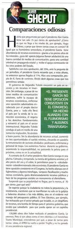 El siguiente es el texto de mi columna de hoy, publicada en Diario 16: COMPARACIONES ODIOSAS¿Habría que preguntarse por qué el presidente Alan García tiene tan sólo 35% de aprobación? ¿Cómo es que no llega a los niveles de, por ejemplo Hugo Chávez, a pesar que tienen tantas cosas en común? Al igual que su homónimo venezolano, el presidente García tiene abundancia de recursos económicos –gracias a los precios altos de los minerales-, goza del aprecio (algunos llaman adulación) de una buena cantidad de medios de comunicación, gasta una cantidad criminal en propaganda estatal y recibe el apoyo conmovedor de los otros poderes del Estado.Satisfecho con esta aprobación, del 35%, ante la pregunta de un periodista, el Presidente García recuerda que, a estas alturas, su antecesor apenas llegaba al 11%. Hizo una comparación, propia de él, fuera de contexto. Olvidó decir algunas cosas que nos permitimos señalar.El gobierno de Alejandro Toledo encontró un país en recesión y sin recursos ni inversión. Sin embargo, a pesar de no tener medios de comunicación adulones, sufrir la escasez de recursos económicos, enfrentar una oposición saboteadora encabezada por el propio doctor García, a pesar de todo ello llevó al país por la senda de la corrección económica, el respeto a los derechos fundamentales y reinsertó al país en el sector internacional. Alejandro Toledo condujo al país en medio de una tormenta implacable, llevándolo a buen puerto. Sin la abundancia de recursos actual, aumentó en tres oportunidades el sueldo mínimo, elevando en paralelo la remuneración de sectores olvidados: profesores, enfermeras y personal de tropa. Los aumentos fueron durante su gobierno, asumiendo la responsabilidad, no pateando la pelota para el próximo, como es en la actualidad.A contrario de él, el señor presidente Alan García navega en una piscina. Calmada y temperada. La inercia del gobierno anterior y el alto precio del oro y el cobre, le permitieron pasar la –calculadamente- sobredimensionada crisis económica. El presidente García no tiene oposición consistente en el Congreso, ha hecho alianzas con el fujimorismo y algunos tránsfugas, tampoco fiscalización y mucho menos contraloría, gasta desmesuradamente recursos públicos y hace de los programas sociales un monumento al clientelismo.Sorprende que su popularidad no llegue, por lo menos, al 70 por ciento ¿por qué será?De repente porque la ciudadanía no tolera la prepotencia y la intolerancia, cuestiones que se manifiestan no sólo en la golpiza o balaceras abusivas a los más débiles, sino en el evidente mal manejo del presupuesto público. El Tren Eléctrico, por ejemplo, fue rechazado por el sector privado por inviable, es un despilfarro de recursos, una bomba de tiempo para el próximo gobierno, que tendrá que subsidiarlo para que pueda operar así un capricho presidencial.130,000 obras dice haber realizado el presidente García. Le creemos. Pero si son obras como el tren eléctrico o el inconcluso Teatro Municipal, entendemos por qué, a pesar de tantas pero tantas obras, el APRA ha vuelto a perder Trujillo y no ha ganado ni una presidencia regional.Juan Sheput