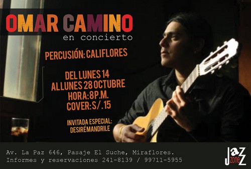 "Omar Camino es un cantautor de Lima, Perú, que me ha fascinado por la manera en que su música está enraizada en las manifestaciones tradicionales e históricas de su país (…) además del atinado manejo de los géneros, su calidad lírica es extraordinaria, y su voz también." Ana Zarina Palafox (México DF 2007) Investigadora de Música El gran cantautor peruano Omar Camino es dueño de un estilo con fuertes raíces en los géneros musicales peruanos y latinos, así como en la fusión que caracteriza a la música contemporánea. Ha representado a nuestro país en múltiples Festivales Internacionales trayendo premios y reconocimientos como compositor e intérprete. Su repertorio incluye valse, landó y festejo así como canciones con aires de Huayno, tangos, sones cubanos, baladas pop y chacareras. A esto se suma el excelente manejo que tiene de la palabra y los versos tradicionales como coplas y décimas. Luego de un tiempo fuera de nuestro país regresa con su Espectáculo “Omar Camino en Concierto” este lunes 28 de septiembre a las 8pm en el Jazz Zone de Miraflores. Lo acompaña el reconocido percusionista Cali Flores y como invitada especial la extraordinaria cantante Desiré Mandrile. La dirección es Av. La Paz 646, Pasaje El Suche, Miraflores, y el cover es de 15 soles. ¡No se lo pueden perder! Diana Cuéllar y Jimena Cuéllar Direccion Cia. "Pasión Flamenca" Centro Andaluz del PerúTlf. 2750714 - 997347910 - 101*5611pasionflamencaperu@yahoo.com