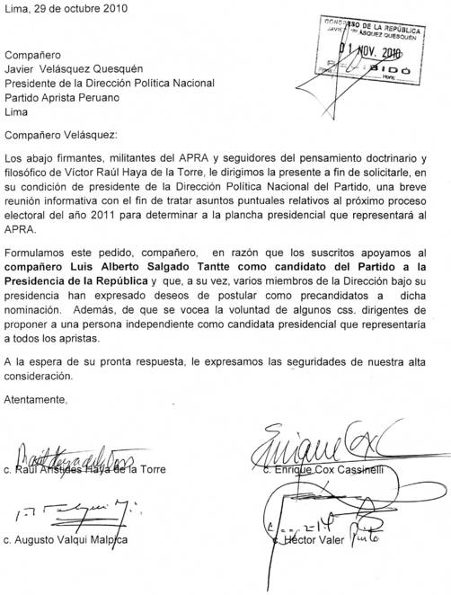 ¡Oficialismo NO responde! 1. Remitida por Raúl Haya de la Torre, Enrique Cox, Héctor Valer y Augusto Valqui dirigida hace dos semanas a Velásquez Quesquén en la cual presentan mi precandidatura. Sin respuesta hasta hoy. 2. Carta remitida por el suscrito a Víctor Díaz Chávez, presidente del Tribunal Nacional Electoral del PAP, en los mismos términos, y hace más de dos semanas también. Sin respuesta hasta hoy. Díaz Ch., como se sabe, es actual viceministro de Educación, designado por AGP.