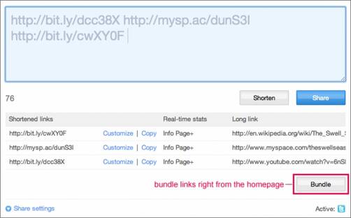 El funcionamiento de los bit.ly Bundles es muy sencillo, y para comenzar a utilizarlo simplemente tendremos que añadir los diferentes enlaces como hasta ahora. Una vez hecho esto veremos un nuevo botón que permite, precisamente, agruparlos todos en una unica URL.