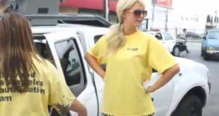 Pero Paris no está dispuesta a perder ni una pizca glamour aunque tenga que darle al estropajo y al rodillo. Es por esto que no se olvidó de ponerse los tacones y unas grandes gafas de sol en su "divertido" día.