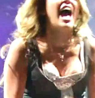 Ya no es una bufona infantil disfrazada, ahora es una chica sexy que sale al escenario, se magrea y se come los morros con las bailarinas, ¡y enseña sus tetas “accidentalmente”! Como Madonna hacía cuando tenía 30 años menos y un matojo entre las piernas como la Selva Amazónica.