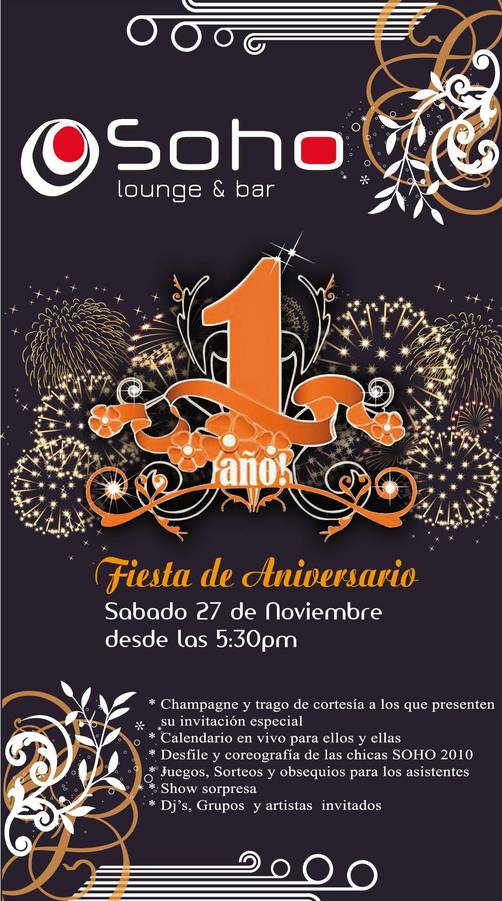 Surgimos como una nueva opción de diversión y nuestro unico fin es darte entretenimiento de calidad... TU ya nos conoces... Tonear en SOHO es como sentirse en CASA!!!Tendremos:- Champagne y Trago de cortesía a los que presenten Invitación Especial- Calendario en vivo para Ellos y Ellas- Desfile y Coreografía de las CHICAS SOHO que nos acompañaron el 2009 - 2010- Juegos, sorteos y obsequios para los asistentes- Show Sorpresa- Dj's, Grupos y Artistas InvitadosHacemos los previos desde las 5.30pmINGRESO LIBRE solo LISTAS hasta las 10.30pmLuego en puerta:S/ 20.00 con derecho a 01 trago* SOCIOS VIP presentando carnet tienen Ingreso Libre + Acompañante* Clientes tienen Ingreso Libre presentando Invitación Especial* CHICAS con BRAZALETE SOHO VIP tienen Ingreso Libre hasta las 12*** Esta fiesta será toda una locura ***Consultas & reservas:4761592 - (98)139*7089reservas@soholoungebar.comwww.soholoungebar.galeon.comVer más