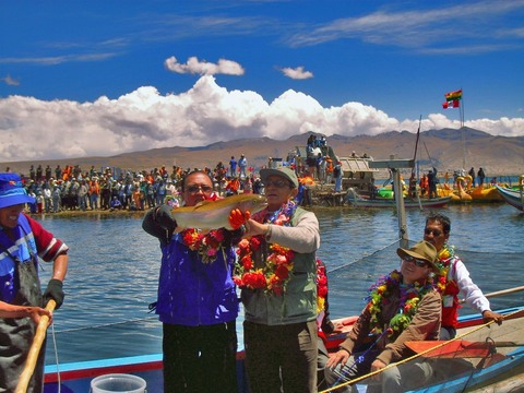 Bajo la custodia de la cordillera de los andes y el sol andino resplandeciente, la tarde del último 27 de septiembre los amantes de la caña de pescar se dieron cita en la localidad de Villurcuni en plena línea de frontera entre Perú y Bolivia para protagonizar la segunda versión del Torneo de Pesca Deportiva denominado “Derby del Salmon Dorado”. Desde tempranas horas de la mañana se congregaron centenares de espectadores para presenciar la competencia en el lago Titicaca, un espacio confinado por técnicos del organismo binacional de diez mil metros cuadrados fueron el escenario propicio para demostrar los dotes de la pesca de más de 60 participantes. Julián Barra Catacora – presidente de la Autoridad Binacional del Lago Titicaca en compañía de las autoridades locales y representantes del Proyecto Especial Lago Titicaca – PELT, fueron los encargados de realizar la tradicional siembra de 200 especies de la imponente “kory challwa” o “trucha dorada del Titicaca”, las mismas que recibieron expresivos elogios. Tres grupos de 22 participantes cada uno, dieron la cuota de tensión y nerviosísimo en cada zumbido del hilo de pescar, el espejo de agua mostraba el revoleteo de la trucha dorada que en solitarios movimientos seducían osadamente a los competidores. De acuerdo al reglamento establecido por los organizadores, una hora era el tiempo suficiente para realizar la pesca; el primer grupo logro conquistar más de seis ejemplares que recibieron el aplauso de los asistentes; el segundo grupo logro imponer 5 unidades y el tercero que cerró la emocionante tarde con 7 esbeltas truchas doradas. Entre los concursantes, destaco la presencia de la delegación boliviana y turistas de diferentes nacionalidades, además de deportistas provenientes de Puno, Apurímac, Arequipa y Cuzco. El jurado emitió el veredicto final en horas de la tarde, teniendo como ganador absoluto a Narciso Salazar Gómez natural de Oruro (Bolivia) que en representación de la Asociación Municipal de Oruro se apropio del primer lugar con un hermoso ejemplar de 2,750 gramos; el segundo lugar fue obtenido por Erick Hunder Monzón natural de Arequipa (Perú) con una especie de 2,600 gramos; mientras que el tercer lugar arrojo un triple empate entre Carlos Jibaja Rivera de Arequipa, Jorge Luis Tuny de Yunguyo y Hernando Barra de Puno con 2,100 gramos cada uno. La Autoridad Binacional del Lago Titicaca y la Municipalidad Distrital de Ollaraya entregaron sendos reconocimientos a los ganadores del “Derby del Salmon Dorado” que por segunda vez consecutiva se realiza a fin de impulsar nuevas alternativas turísticas en la línea de frontera. Queremos hacer de esta actividad un evento permanente para desarrollar el circuito turístico entre Perú y Bolivia, en esta oportunidad ha crecido el número de participantes e imaginamos que para la tercera versión exista mayor participación; asevero Julián Barra Catacora de la ALT. La pesca deportiva es uno de los deportes que atrae a los turistas, en Sudamérica solo Argentina ha desarrollado esta disciplina y nosotros queremos impulsarla en las aguas del Titicaca que reúne las condiciones paisajistas en diferentes lugares del anillo circun lacustre; reiteró Barra Catacora de la ALT. Narciso Salazar proveniente del lago Poopó en Oruro (Bolivia), declaro que los pueblos andinos tienen un potencial natural en el sistema TDPS y que sus espacios reúnen todas las condiciones para organizar actividades de esta naturaleza en concordancia con nuestras costumbres y tradiciones, preservando a nuestra “Mama Kota” (madre agua). Asimismo, Erick Hunder agradeció la oportunidad que le brindaron los organizadores y solicito a los autoridades binacionales realizar con frecuencia torneos de pesca para impulsar el desarrollo socio económico de las poblaciones. Mientras que la paciencia y la habilidad conjugaban en las aguas del Titicaca, en tierra se realizaba el clásico de futbol de “cholitas” de Perú y Bolivia, la victoria fue para el representativo peruano que derroto a su similar de Bolivia por la mínima diferencia. Por otra parte, Rubén Medina Cruz el “Tritón del Titicaca” mostro sus habilidades al nadar una distancia de 3 kilómetros con grilletes en los pies; danzas y música autóctonas combinaron una tarde de entusiasmo con los miles de visitantes que fueron secuestrados por el sabor de la gastronomía andina en base a trucha y sus productos locales. La actividad no solo fortaleció la pesca deportiva sino también promovió el turismo en la poblaciones circunlacustres, por ello se evidencia la presencia de familias enteras disfrutando del paisaje y actividades paralelas preparadas para la ocasión, mencionó Juan Huanca Coarita – alcalde provincial de Yunguyo. Otros datos Entre los participantes, se conto con la presencia de funcionarios de la Embajada del Perú en Bolivia, Consulado del Perú en El Alto, Alcaldes distritales y periodistas de Bolivia y Perú. En el cerco establecido también existieron más de 700 especies de trucha arco iris. Los organizadores proporcionaron los instrumentos de pesca a todos los participantes. En Huatajata, la ALT y la Prefectura de La Paz organizaran en noviembre la primera versión del Derby del Salmon en Bolivia. La comunidad de Villurcuni, se encuentra en plena línea de la frontera peruano boliviana, pertenece al distrito de Ollaraya en la provincia de Yunguyo; su población se dedica al comercio y la agricultura para consumo local, limita con la tercera sección del gobierno municipal de Copacabana denominada Tito Yupanqui.