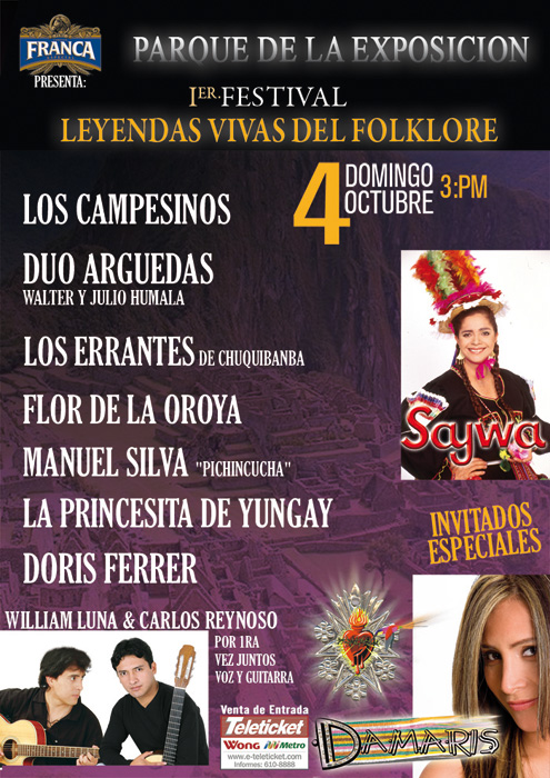 Los Campesinos, Duo Arguedas, Los Errantes Chuquibamba, Flor de la Oroya, Manuel Silva "Pichincucha", La Princesita de Yungay, Doris Ferrer,... Domingo 4 de Octubre a partir de las 3 de la tarde.