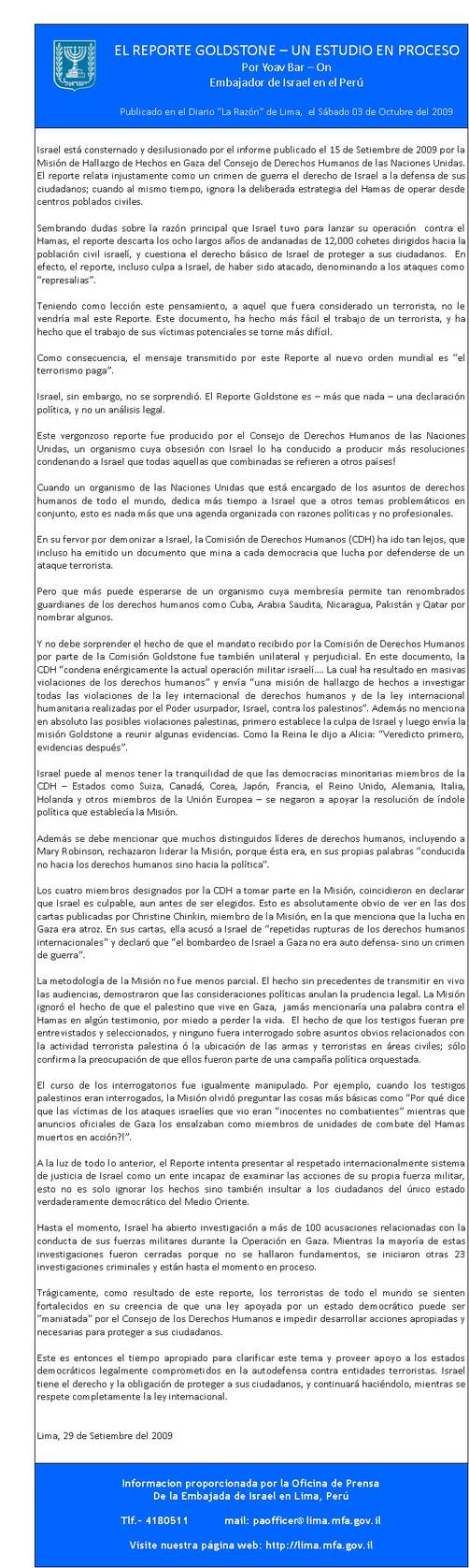 Artículo del Embajador Yoav Bar-On sobre el Reporte Goldstone