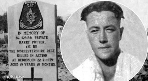 “En memoria del soldado Harry Potter. Regimiento Worcestershire, muerto en acción en Hebrón el 22/7/1939 a los 19 años y 10 meses”, reza el epitafio.
