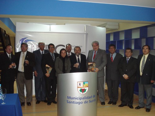 El Doctor Walter Alba Alba en el centro, rodeado de un nutrido grupo de los presentes. A la derecha del doctor Alba, el Presidente del ILEC, don José Guzmán Estrada (con terno plomo).