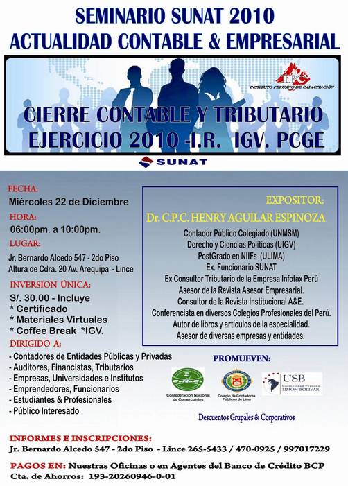 FECHA:MIÉRCOLES 22 DE DICIEMBRE DEL 2010HORA:06:00PM. A 10:00PM. LUGAR: INSTITUTO PERUANO DE CAPACITACIÓN - IPC JR. BERNARDO ALCEDO 547 - 2DO PISO - LINCE - ALTURA DE LA AV. AREQUIPA CDRA 20- ESPALDA DE LA MUNICIPALIDAD DE LINCEINVERSIÓN ÚNICA: S/. 30.00 Incluye - IGV. - CERTIFICADO - MATERIALES - COFFEE BREAK DIRIGIDA A: - CONTADORES DE ENTIDADES PÚBLICAS Y PRIVADAS- AUDITORES, FINANCISTAS, TRIBUTARIOS.- EMPRESAS, UNIVERSIDADES E INSTITUTOS.- EMPRENDEDORES, FUNCIONARIOS.- ESTUDIANTES & PROFESIONALES.- PÚBLICO INTERESADO. INFORMES E INSCRIPCIONES: JR. BERNARDO ALCEDO 547 - 2do Piso. Lince265-5433 / 470-0925 / 997017229 - capacitacion@institutoipc.com PAGOS EN: - Nuestras Oficinas.- Deposito en Agentes del BCP: Cta. de Ahorros. 193-20260946-0-01 PROMUEVEN: - CONFEDERACIÓN NACIONAL DE COMERCIANTES - CONACO- COLEGIO DE CONTADORES PÚBLICOS DE LIMA - CCPL- UNIVERSIDAD SIMÓN BOLÍVAR - USB DESCUENTOS GRUPALES Y CORPORATIVOS. VACANTES LIMITADAS.
